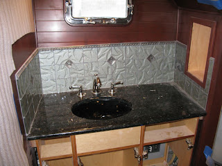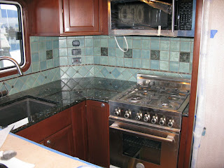 Then I continued up to the galley and discovered that the guys had partially uncovered the counters and backsplash so I snapped another shot. They must have seen me with my camera out. The granite is spectacular and as previously reported, I love the Bertazzoni range. On our next boat, this will be my choice.