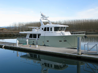 Its been a busy week but I headed over to NW 5001 yesterday to see, first hand, the progress being made. I am always amazed at what the guys have accomplished. The boat is even more impressive in person than in pictures but I couldn’t resist taking some more shots and posting them. Please bear in mind that the boat is still under construction so there is some dust and many things are not quite finished yet.As I approached, this was what I first saw. The first think I noticed was how well she sits on her lines. Kudos to Steve Seaton for nailing the weight distribution. If you look carefully, you will see the new window arrangement on the port side of the pilothouse. (Click the image to enlarge it). Also notice the opening portlight aft of the angled window. This was an addition that the owners requested. I must admit that I was dubious of how it would look, but now I think it looks terrific.