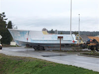 The hull has been secured to the trailer and now to get it out the door. I sure hope someone measured carefully. (just kidding) But it was a tight fit. Only a few inches on either side to spare. I looks like we will have to get a building with a bigger door before we begin the 52 or 62 which are considerably wider.