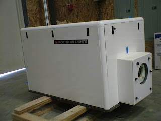 The generator arrived, a Northern Lights 12KW unit. At the right is the power take-off cover. We ordered this option because of the BAT drive that we are installing. We may also cross plumb the BAT drive hydraulic system to the main hydraulics as a backup in case of failure.