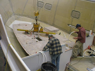 There seem to be a lot of details that are getting attended to. The plumbing under the forward lower deck is complete so now Dave and Phil can position the deck so that Greg can bond it in place.