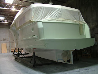 Here is a shot from the stern. The bottom paint will be black and the boot stripe will be painted the same Oyster White as the superstructure.