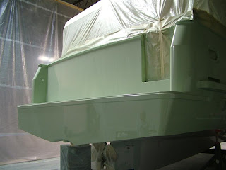 Ok…..I wasn’t going to show pictures of the painted hull until later, but the cat is out of the bag so here they are. The picture really doesn’t do it justice as the shots were taken inside the darkened building. The color is “Laurene Green” and is really spectacular. (not my words but those of a client) The color was not blended or named originally by us, but rather by Bill Parlatore of Passagemaker Magazine. Named for his wife, Laurene, it is the color that Bill originally painted his rowing scull; the one featured in Passagemaker last summer.