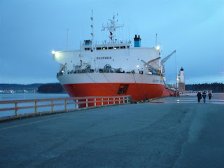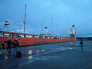 The following morning dawned clear and icy. Here are some pictures of Super Servant 3 at the dock.We boarded the ship and met with the shipping agent who had all of our documents already processed with Canadian Customs. We then were off to inspect Nor’wester to see if there was any damage.