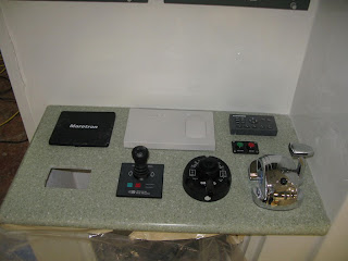The cockpit control panel seen below includes state of the art electronics. A fishfinder, chart plotter, radar, and a complete camera system are all accessed on the large screens.Below is a closer look at the controls. There is a Maretron repeater, autopilot control, jog stick, shifter, bow thruster control, and in the cutout will be the controls for the hydraulic Wesmar APU (auxiliary power unit). The Wesmar APU will be used for trolling as it gives very good control at slow speeds. The unit gets its power from the generator.