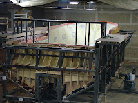 Today was another banner day. I have been busy all week and unable to get down and take pictures of the bulkheads installed but I guess they are in there as today we split the mold. Here is a picture of the mold before splitting. They have installed the tracks on either side so that once the mold is split, the two halves can be rolled out of the way.