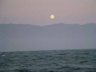 This is the moon rise. We were north of San Luis Obispo when this was taken. The full moon was awesome to see, especially when the high swells would pass beneath us. The peaks and valleys of the water with the white caps glistening were beautiful.