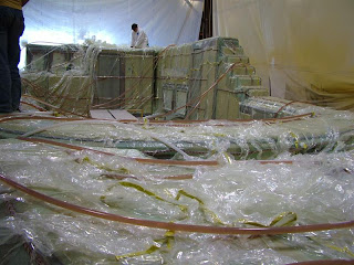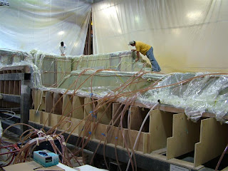 Patrick (yellow shirt) is inspecting to make sure that the resin is uniformly infusing. You can see all of the tubes that run to various parts of the mold.