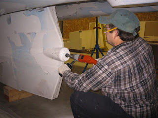 Above is the engine liner nestled into the keel. The engine liner is a one piece molded (infused) part that integrates the engine mount attachment points to the hull. The bottom of the liner serves as a drip pan keeping any fuel or oil residue from mixing with the bilge water. Notice the bonding grid is also in place. It will be glassed in and forms the ground system that connects everything to the sacrificial zincs.