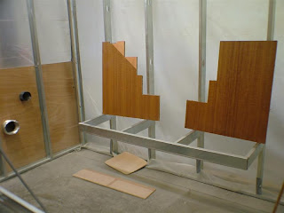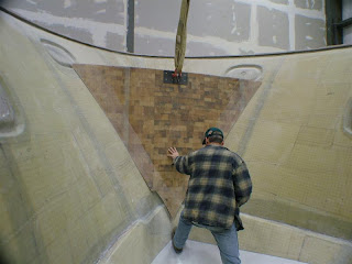 I caught Don as he was placing the forward bulkhead in place. This is the bulkhead between the forward master stateroom and the anchor locker. There will not be any access to the anchor locker here as we want to eliminate any chance of water or odor intrusion into the stateroom. Have you ever sniffed an anchor locker???? Not pleasant. This will be a watertight bulkhead.